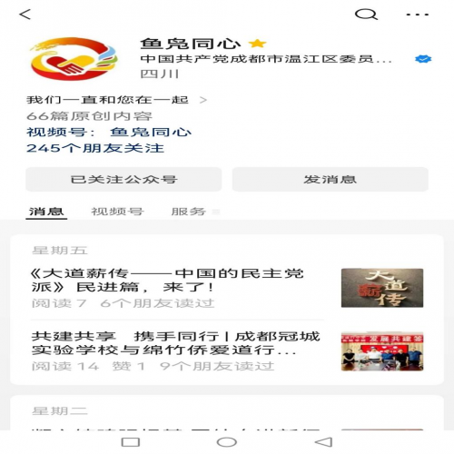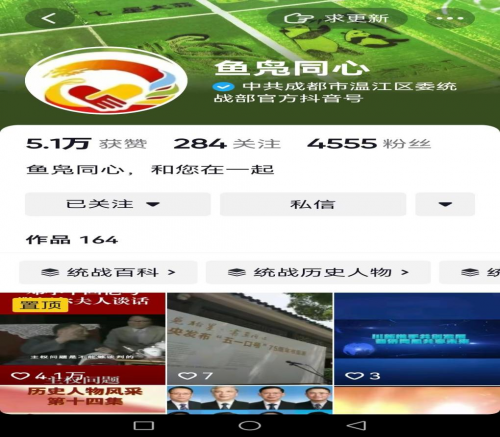 二是聚焦“新”字,完善宣传载体,放大统战声音。丰富“鱼凫同心”微信公众号内容,围绕温江“三个之区”建设,增设“共享希望、同创大美、心安共建”版块,浏览量达2万余次,围绕统战人物故事,增设“统战史话”版块,连载推文37期,今年新增粉丝5626人,阅读量13万余次。抖音号新增统战百科将统战知识进行形象展播、全方位动态展示温江统战故事,新增粉丝1622人,其中“汪文斌引用中国老歌回应拜登涉台言论”点击量近15万,“温江区喜迎二十大老照片展”被央视频等中央级和省级报道20余条,线上3D展浏览量达26372次。